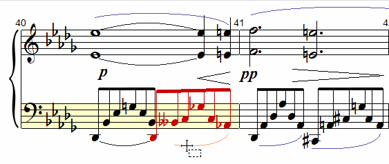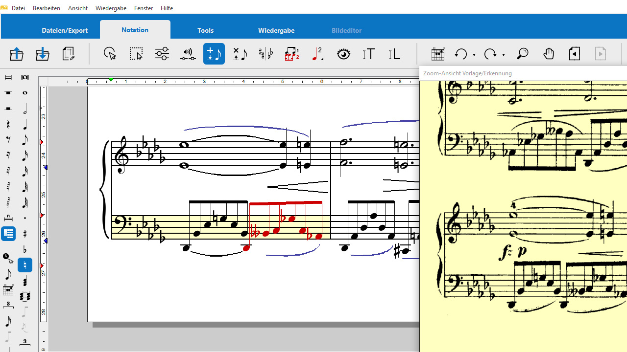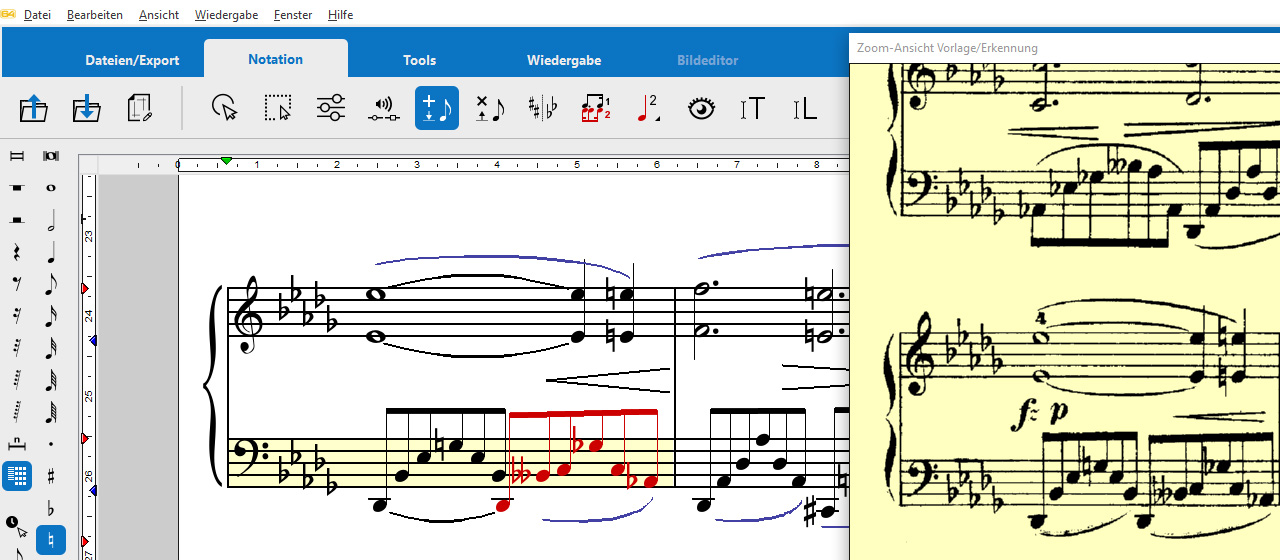 Nun, zunächst ist entscheidend, dass wir in der erkannten Notation die Stellen ausfindig machen, bei denen es fälschlicherweise zu einer Zusammenführung von nebeneinander stehenden Noten gekommen ist. In der Regel wird man beim Abspielen des erkannten Notentextes gleich "mit den Ohren darauf stoßen". Aber auch farbig markierte Takte, die augenscheinlich vollkommen korrekt erkannt worden sind, stellen ein Indiz dafür dar, dass bei der Zuordnung von Noten zu Taktschlägen etwas nicht stimmt.