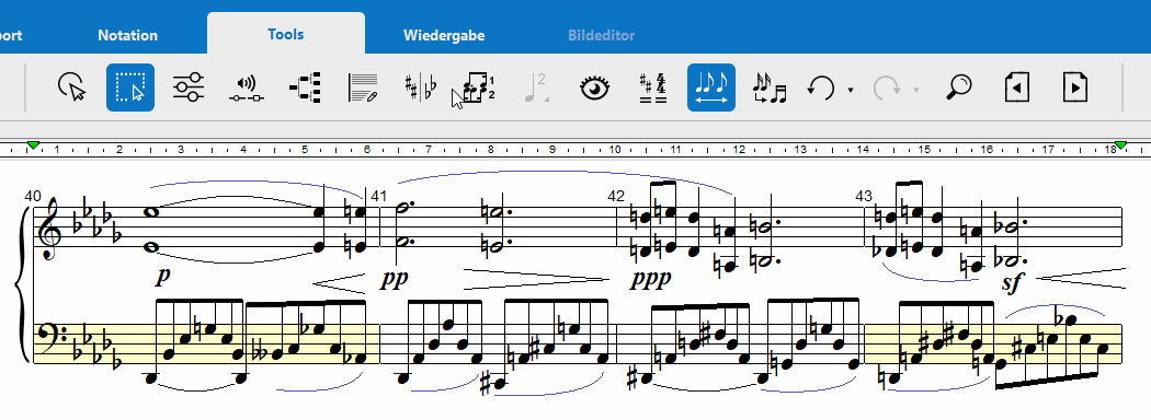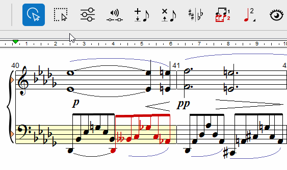 Dieses Werkzeug finden wir in den Toolleisten "Notation" und "Tools". Es sorgt dafür, dass polyphone Stimmen innerhalb unserer erkannten Notationen unterschiedlich farbig angezeigt werden. Findet sich nun in einem einstimmig notierten Takt plötzlich eine zweite (farbige, polyphone) Stimme, dann zeigt dies, dass zwei Noten am Übergang von der einen zur anderen Stimme auf einem Taktschlag zusammengeführt wurden.