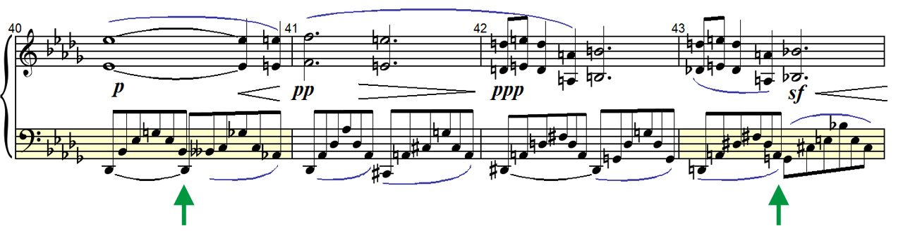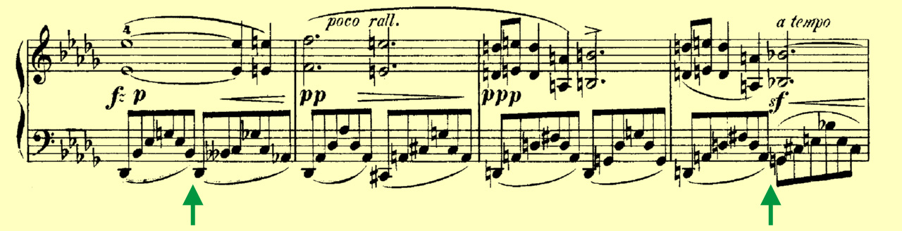 Chopin-Notenvorlage: Die letzte und erste Achtel der Balkengruppen liegen sehr eng aneinander (grüne Pfeile).