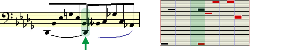 Dieses Raster erfüllt verschiedene Funktionen. So definiert es u. a. einen horizontalen Mindestabstand für Noten. Dieser entscheidet darüber, ob zwei aufeinanderfolgende Töne als ein voneinander getrenntes oder als ein gleichzeitig klingendes "Ereignis" (MIDI-Event) erkannt, dargestellt und wiedergegeben werden. Eine solche "Weichenstellung" macht absolut Sinn, z. B. wenn wir an polyphon notierte Musik denken. Bei dieser werden bekanntlich Töne von zwei unabhängigen Stimmen in einem Notensystem, die auf einer Zählzeit "unisono" oder im Sekundabstand zusammenfallen, richtigerweise versetzt notiert (nebeneinander). Bei der Wiedergabe erklingen sie aber gleichzeitig, so wie im folgenden Beispiel: