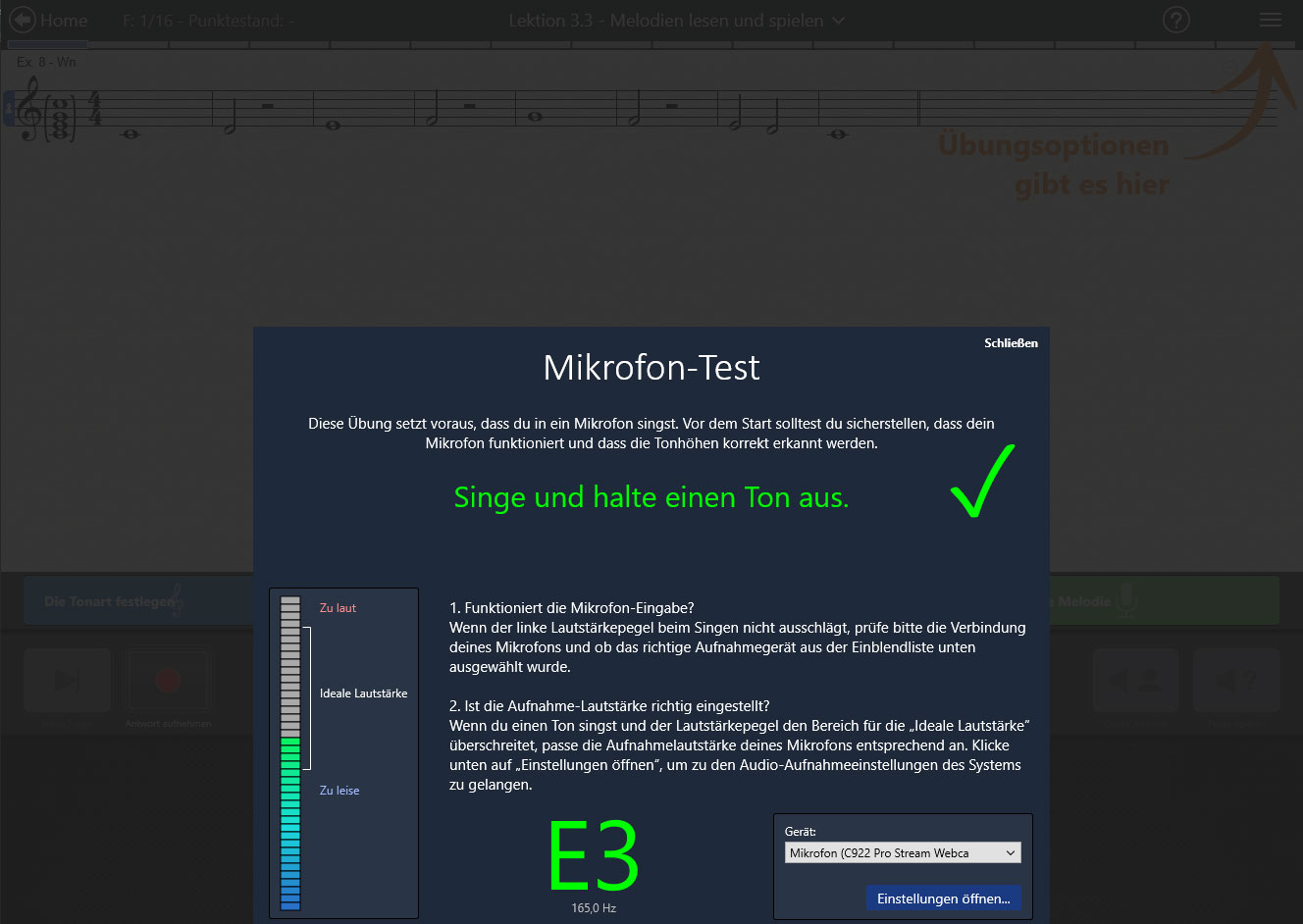 - Interaktive Gesangsübungen mit Echtzeitauswertung und Feedback zur Intonation (Tonhöhen) und rhythmischen Genauigkeit deiner Performances.