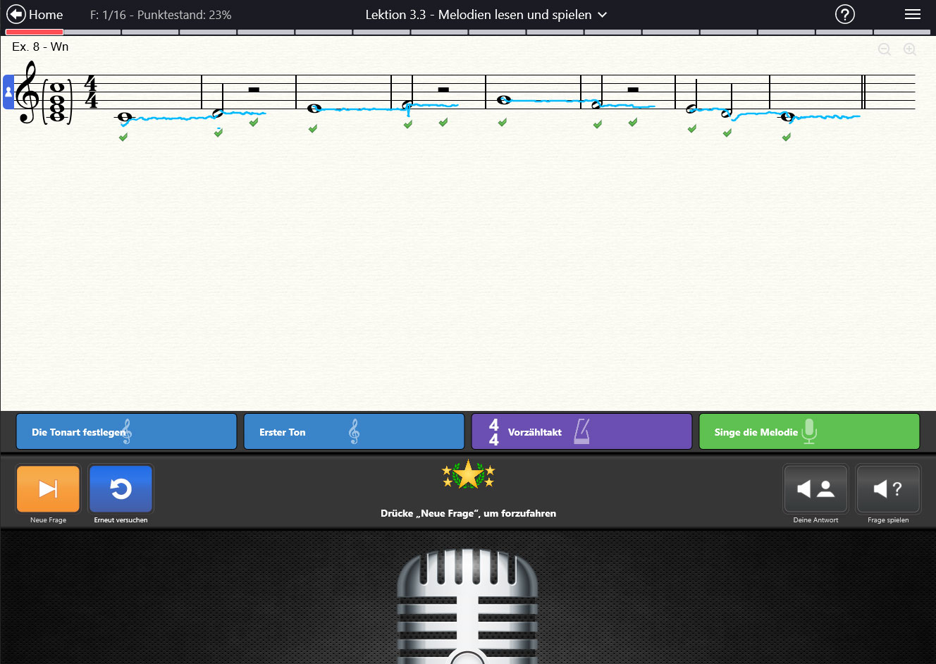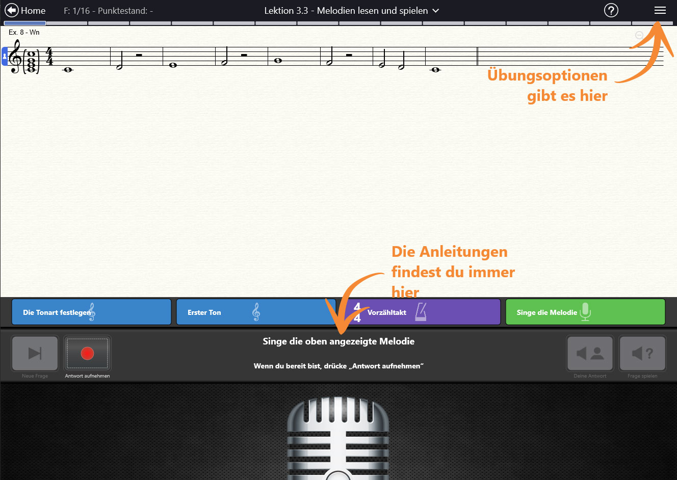 - Mehr als 425 Lektionen mit über 1.500 Übungen zum Vom-Blatt-Singen (Solfeggio).