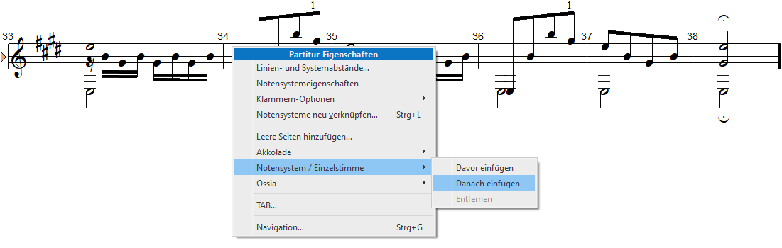Wähle Notensystem / Einzel­stimme > Davor/Danach einfügen.