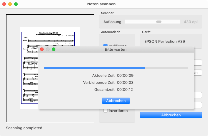 Klicke auf die Taste Scannen , die sich in der Dateien/Export-Toolleiste befindet. Du kannst auch den Menü­befehl ☰ DATEI > Noten scannen > Scanvorgang starten aufrufen.