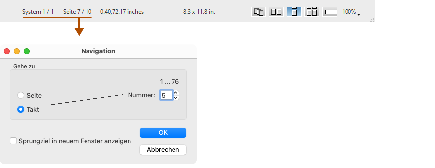 In der Statuszeile des Programm­fensters (unten) findest du die Angaben Seite. Wenn du diese Angaben anklickst, erscheint das Fenster Navigation. Dort kannst du einen bestimmten Takt oder eine bestimmte Seite direkt ansteuern.