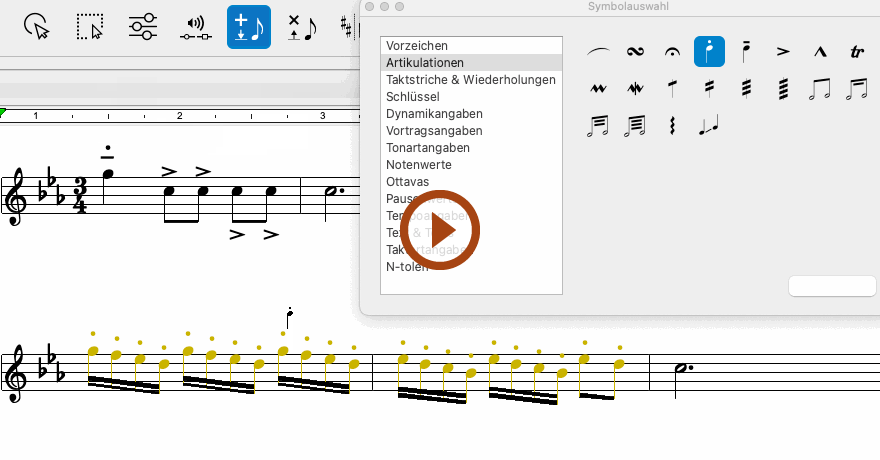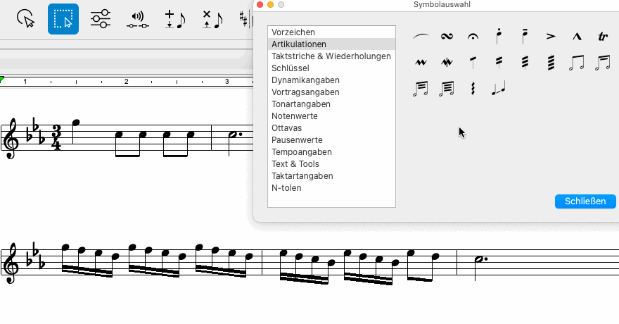 Wähle das Artikulationszeichen, das du den Noten hinzufügen möchtest, aus der