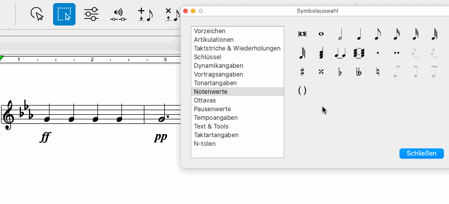 + Klick), um die Dynamikangabe - sofern vorhanden - direkt in der Notation als Tool anzuwählen.