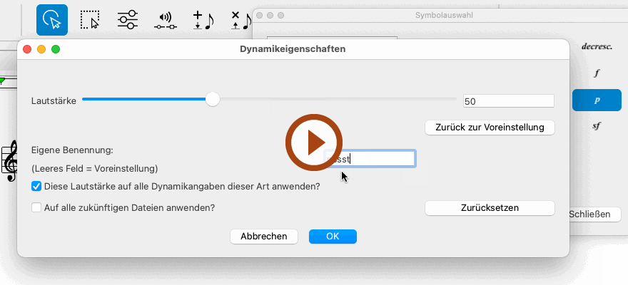 Eigene Benennung: In diesem Feld kannst du einer Dynamikangabe eine beliebig andere Bezeichnung geben, die dann in den Noten erscheint.
