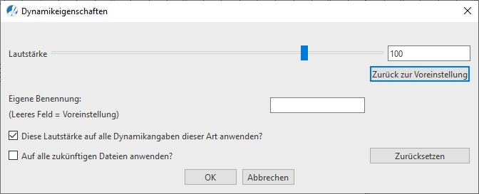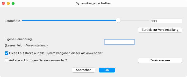 Zurück zur Voreinstellung (Taste): Klicke hier, um die vorgenommenen Änderungen zu verwerfen. Die Einstellungen für die Dynamikangabe werden in den Stand zurückversetzt, den du beim Öffnen des Fensters vorgefunden hast.