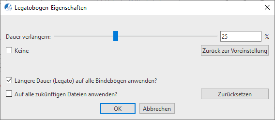 Zurück zur Voreinstellung (Taste): Klicke hier, um die vorgenommenen Änderungen zu verwerfen. Die Einstellungen für den Legatobogen werden in den Stand zurückversetzt, den du beim Öffnen des Fensters vorgefunden hast.