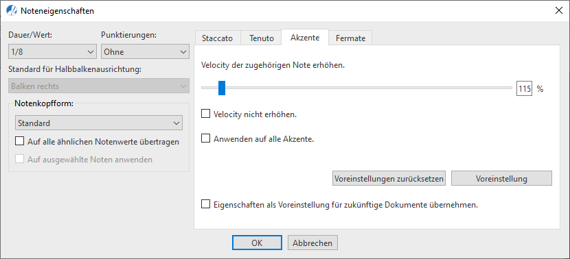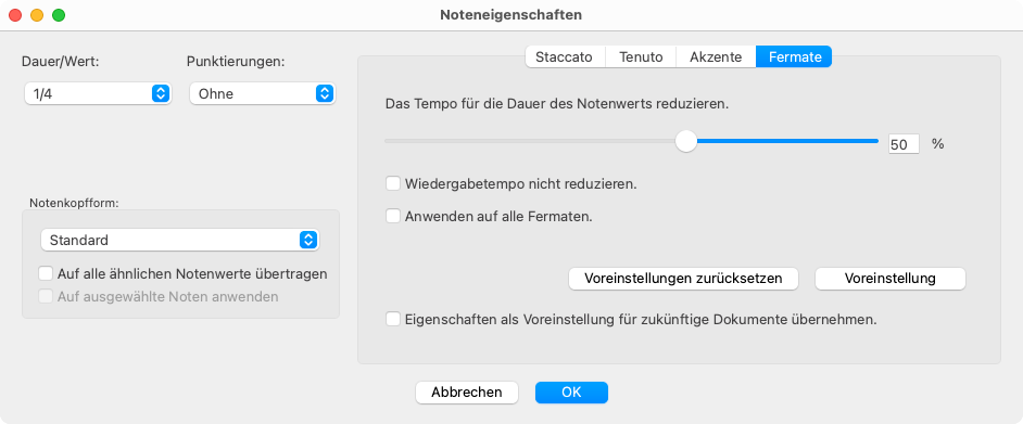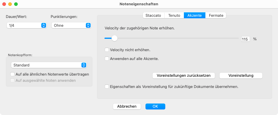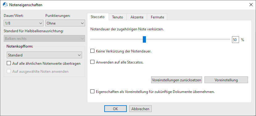 Einstellungen für zukünftige Dokumente über­nehmen: Hiermit definierst du qausi neue Programm­vorein­stellungen für die Wieder­gabe­eigen­schaften von Staccatos, Tenutos, Akzenten und Fermaten.