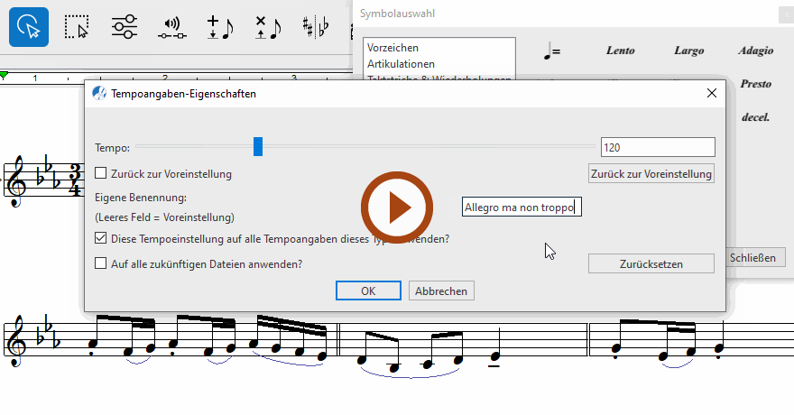 + Klick), um die Tempoangabe - sofern vorhanden - direkt in der Notation als Tool anzuwählen.