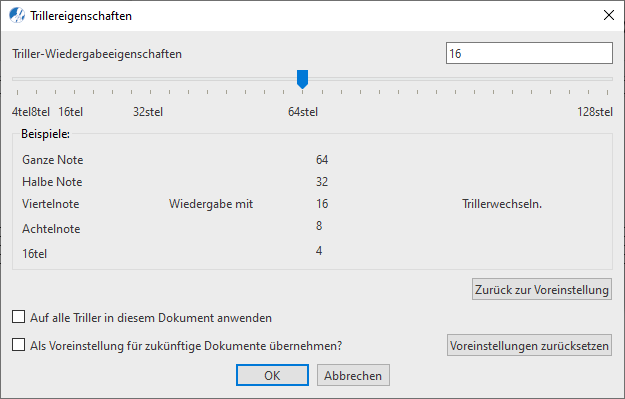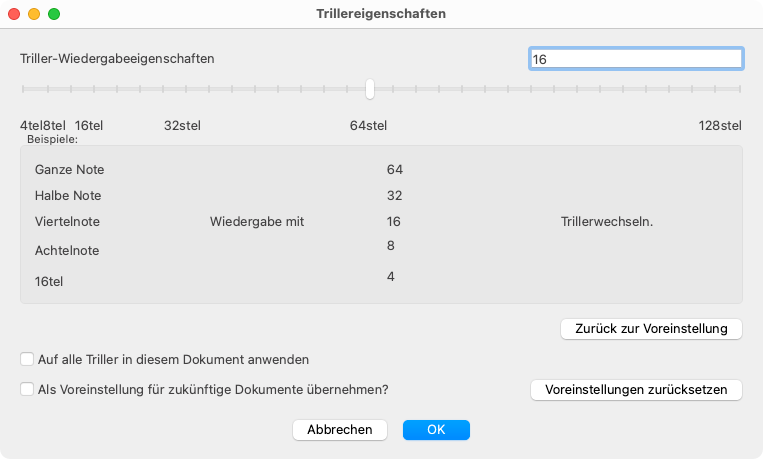 Mit den Funktionen innerhalb des Fensters kannst du definieren, wie ein Triller wiedergegeben werden soll. So kannst du z. B. die Anzahl an Notenwechseln einstellen. Die angepassten Wiedergabeeigenschaften kannst du für jeden einzelnen Triller individuell oder für alle Triller im aktuellen Dokument festlegen.