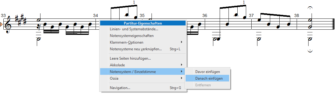 Ein Notensystem in ein bestehendes ENF-Dokument einzufügen oder aus diesem zu entfernen bzw. es ausblenden geht ganz leicht. Solche Systembearbeitungen erledigst du einfach mit dem Eigenschaften-Tool mittels Rechtsklick in ein beliebiges Notensystem. Wie es geht, erfährst du hier.