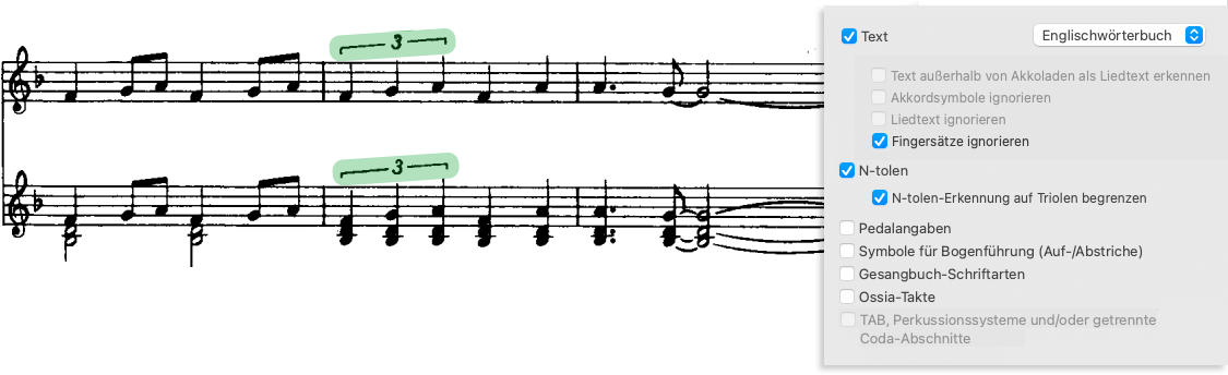 Vielleicht möchtest du, dass ganz bestimmte Elemente deiner gescannten oder importierten Noten bei der Erkennung berücksichtigt werden, andere aber nicht. Im Tab Optionen des Fensters Notenerkennung findest du eine ganze Liste an Notationselementen, die du an- und abwählen kannst.