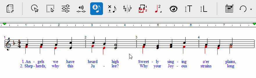 auf deiner Computertastatur oder wähle . Alle angewählten Zweiklänge innerhalb der Partitur werden nun in separate (polyphone) Stimmen aufgeteilt und unterschiedlich farbig dargestellt.