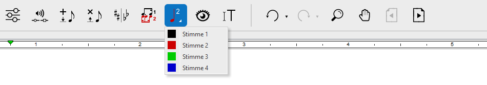 Falls noch nicht geschehen, aktiviere die farbige Anzeige von Stimmen im System, indem du auf die Taste Farbmodus Stimmen klickst. Diese findest du in der Toolleiste Notation sowie in der Tools-Toolleiste.