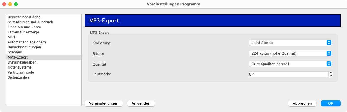 Übrigens: Die MP3-Exporteinstellungen (Kodierung, Bitrate, Qualität, Lautstärke) kannst du unter >MP3‑Export individuell anpassen: