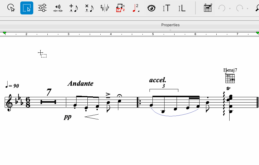 Wähle das Eigenschaften-Tool . Du findest es in den Toolleisten Notation, Tools und Wiedergabe. Noch einfacher gelingt der Aufruf des Eigen­schaften-Tools mit der ESC-Taste auf der Computer­tastatur.