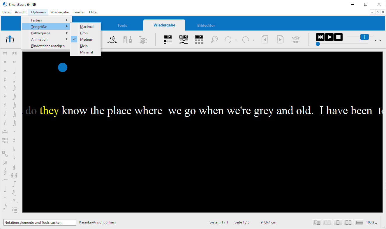 . Du kannst auch den Menübefehl dazu verwenden, das aktuelle SmartScore-Dokument im Karaoke-Ansichtsfenster zu öffnen.