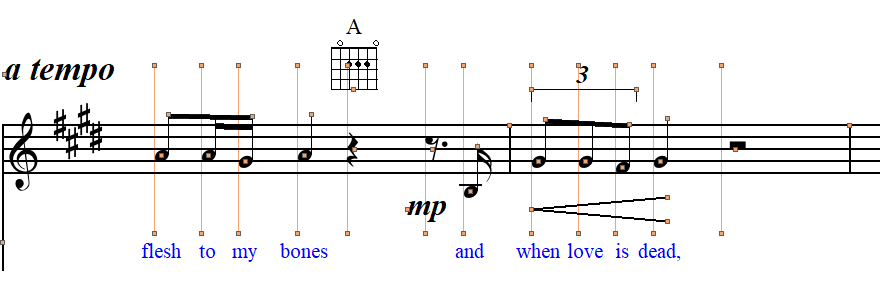 Bei aktivem Ausrichtungsmodus werden an den Notationssymbolen und -elementen kleine Markierungen angezeigt. Klicke und ziehe bei gedrückt gehaltener -Taste an einer solchen Markierung, um das dazugehörige Symbol zu verschieben.