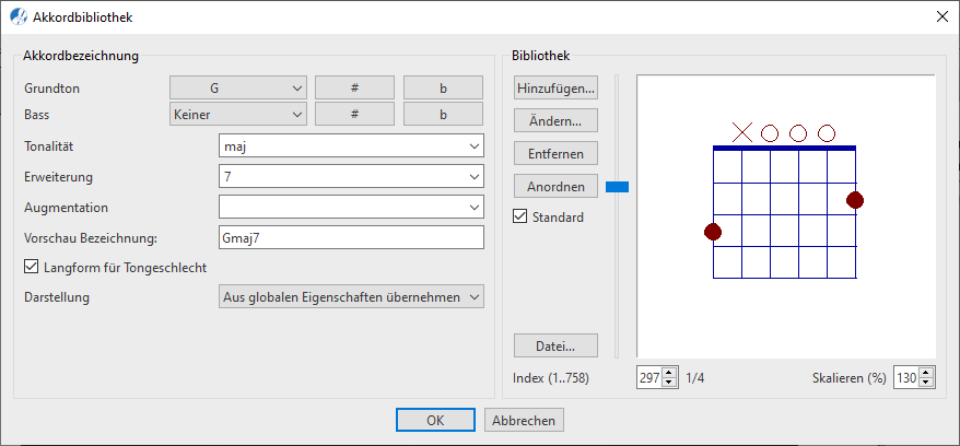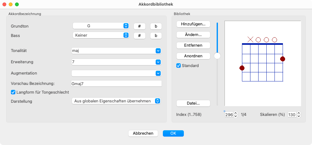 Wenn du eine Akkordbezeichnung gebildet hast, die sich bereits in der Bibliothek befindet, erscheint das dazugehörige Griffbilddiagramm im rechten Bereich des Fensters.