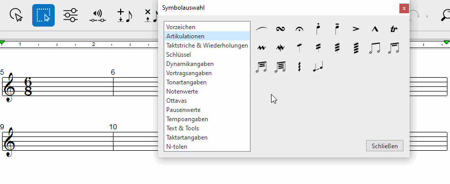 Das Fenster Tonart­eigen­schaften dient dazu, um eine ange­klickte Angabe in eine andere Tonart­angabe zu ändern. Alter­nativ kannst du natürlich eine andere Tonart­angabe aus dem Fensters Symbol­auswahl wählen und im Einfügen-Modus auf die zu ändernde Angabe klicken.