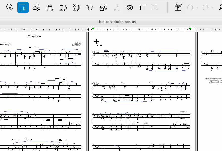 Nach dem Einfügen oder Entfernen einer Akkolade kann es erforderlich sein, die Abstände der verbliebenen Akkoladen neu zu justieren. Verwende dazu die roten Abstandsreiter im vertikalen Linial links oder das Tool zur Anpassung der Akkoladen-/