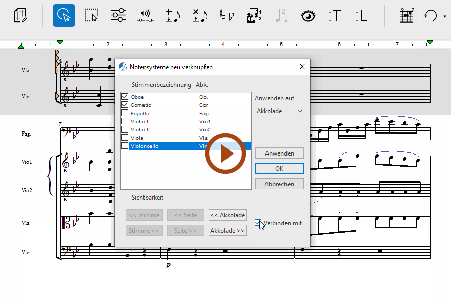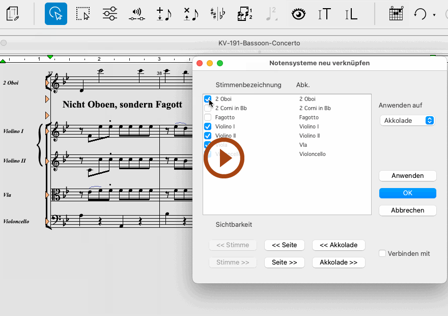 Bitte denke daran, dass du im Fenster Notensysteme neu verknüpfen nie mehr Systeme in der Liste aktivieren kannst, als in der jeweils angezeigten Akkolade tatsächlich auch vorhanden sind.