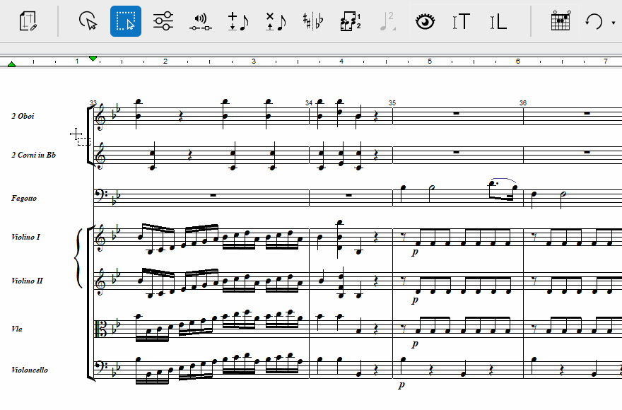 Positioniere den Mauszeiger auf dem Notensystem, das mit einem nächsten System oder einer nächsten Akkolade verbunden werden soll. Drücke dann