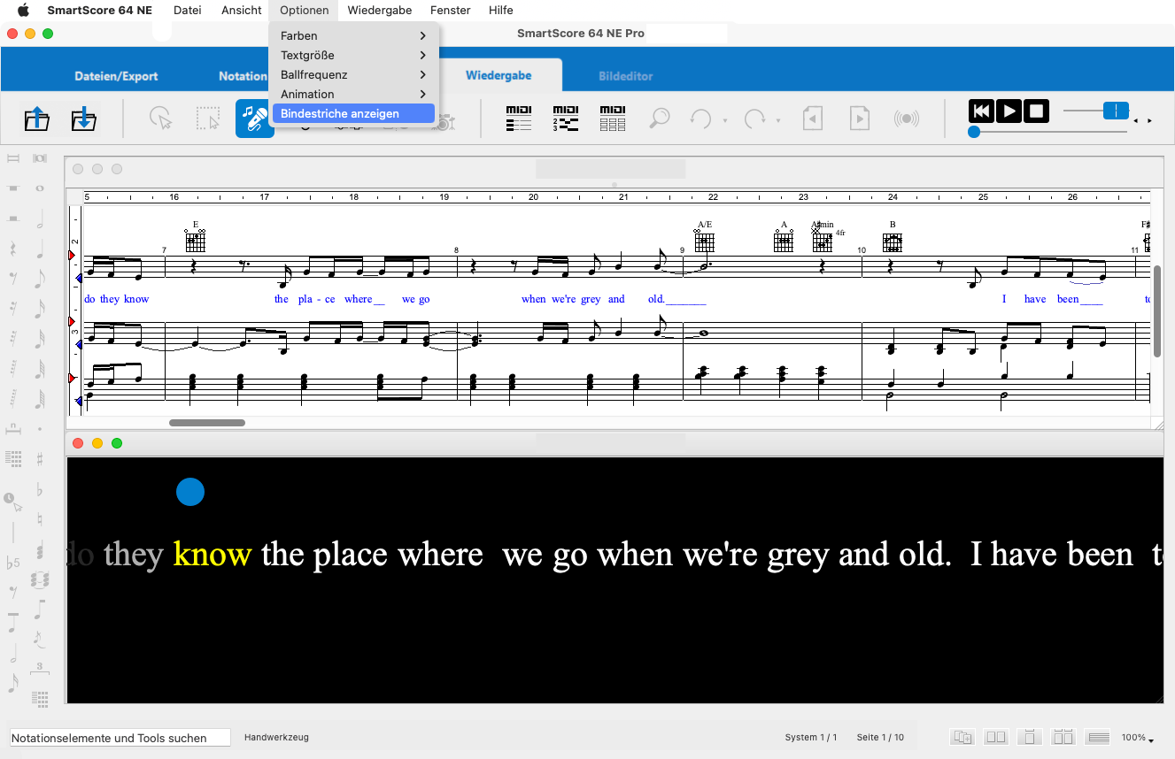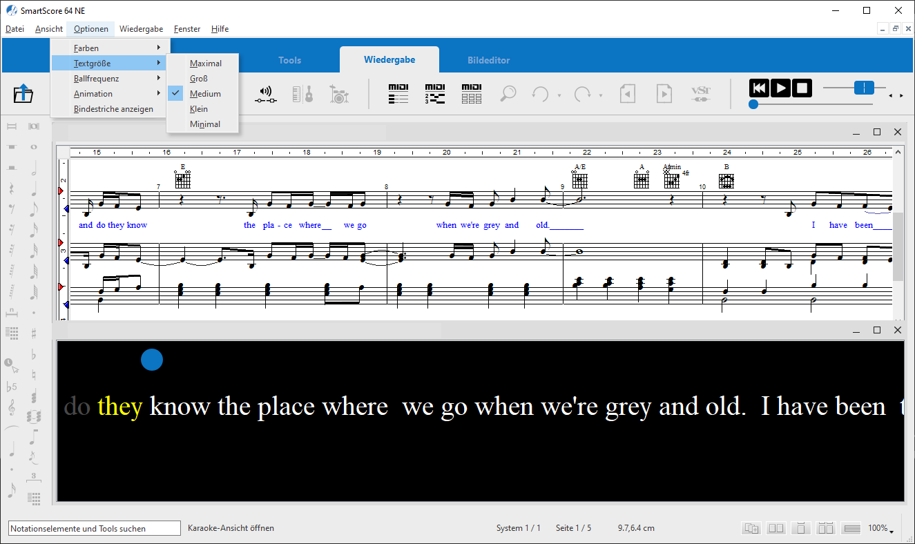 Liedtext bei der Wiedergabe aktiv, scrollt der Text von rechts nach links horizontal durch das Karaoke-Fenster, während der Tempoball an seiner Position hüpfend verharrt. Aktivierst du hingegen die Option