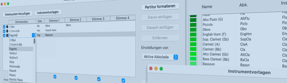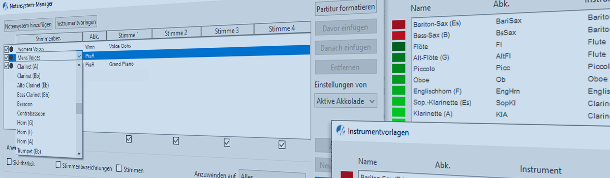 Manager organisieren und verwalten. So auch der Notensystem-Manager von SmartScore. Dieses leistungsstarke Tool hilft er dir dabei, Notensysteme einzufügen oder zu entfernen, "optimierte" Akkoladen mit ausgeblendeten Systemen zu erstellen, Stimmenbezeichnungen zu bearbeiten, zugeordnete Instrumentensounds zu verwalten und sogar die Sichtbarkeit von polyphonen Stimmen in einem Notensystem zu steuern.
