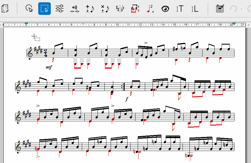 Jedes Notensystem einer in SmartScore erkannten Noten­vorlage, die in Standard­notation notiert ist, kann in ein Tabulatur­system umge­wandelt werden. Umgekehrt geht das aber auch. Neben verfüg­baren Standard-TAB-Systemen für Instru­mente mit vier, fünf oder sechs Saiten kannst du auch dein komplett eigenes TAB-System defi­nieren und als Vorlage speichern.
