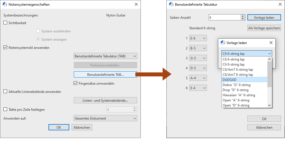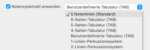 Aktiviere das Options­feld Noten­systemstil anwenden und wähle aus der Liste eine andere TAB-Konfigu­ration. Oder du lädst bzw. erstellst eine Benutzer­definierte TAB (siehe oben). So kannst du z. B. eine Gitarren-TAB leicht in eine TAB für Ukulele umwandeln.