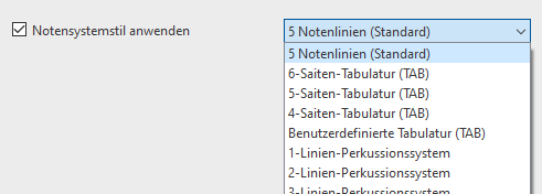 Aktiviere das Options­feld Noten­systemstil anwenden und wähle aus der Liste den Eintrag 5 Noten­linien (Standard).
