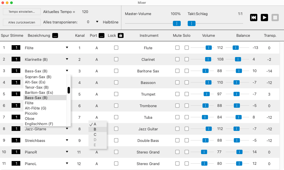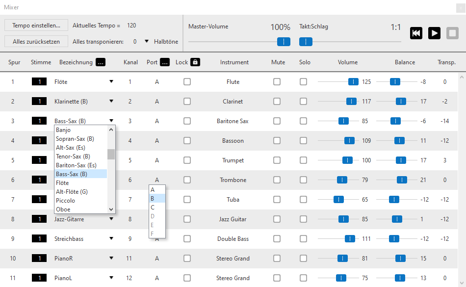 Hier kannst du je Stimme/Spur einen anderen Buchstaben und damit einen anderen MIDI-Port zuweisen. Mit den MIDI-Ports steuerst du, mit welchem Soundfont oder Instrumenten-Plugin die jeweilige Stimme/Spur wiedergegeben wird. Mit der kleinen Taste neben der Bezeichnung "Port" öffnest du das Wiedergabe-Setup.