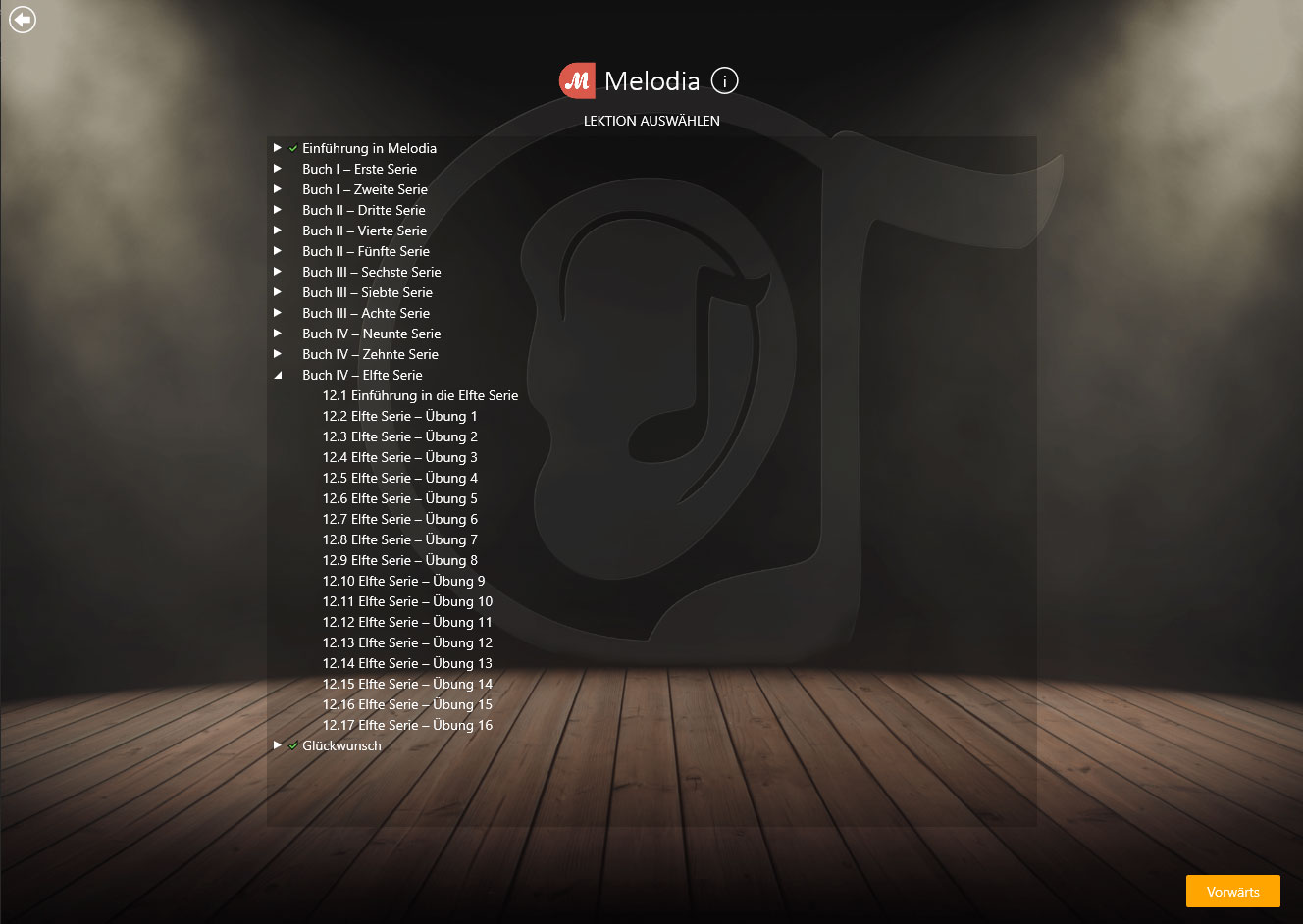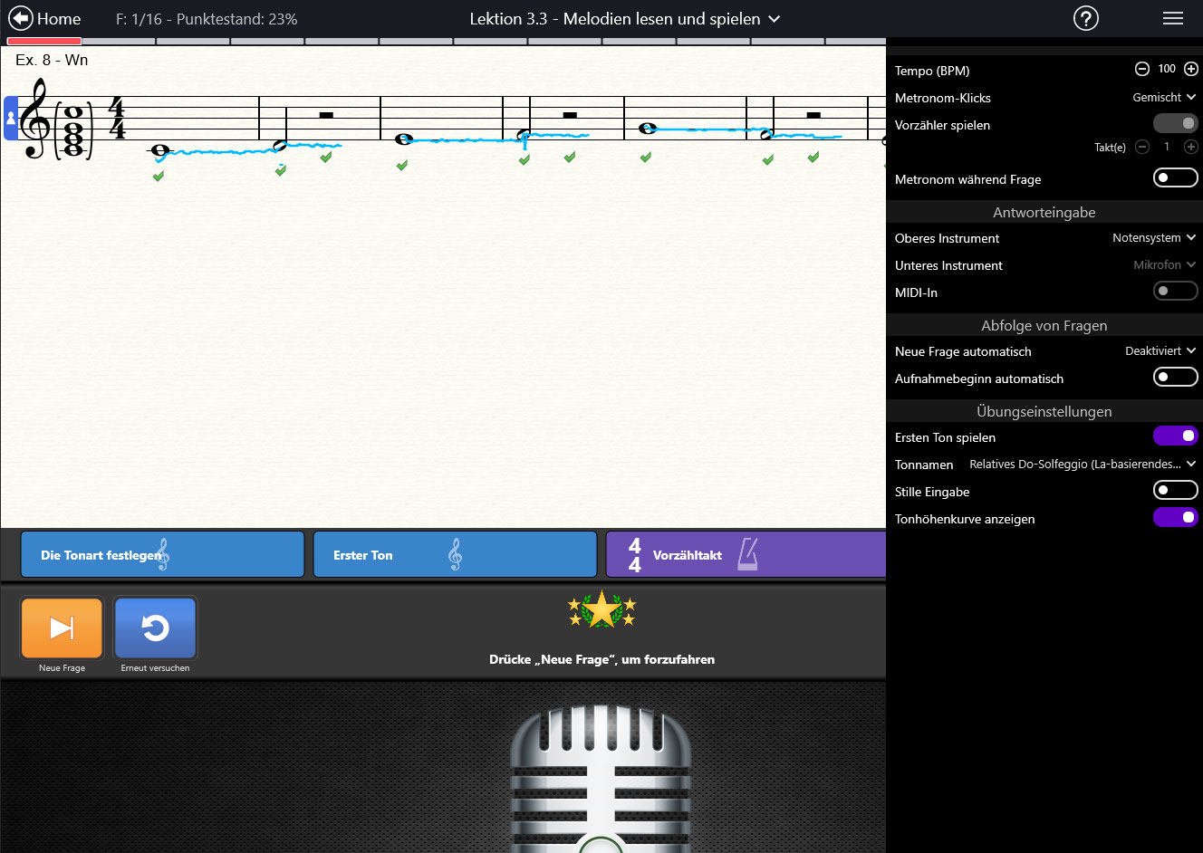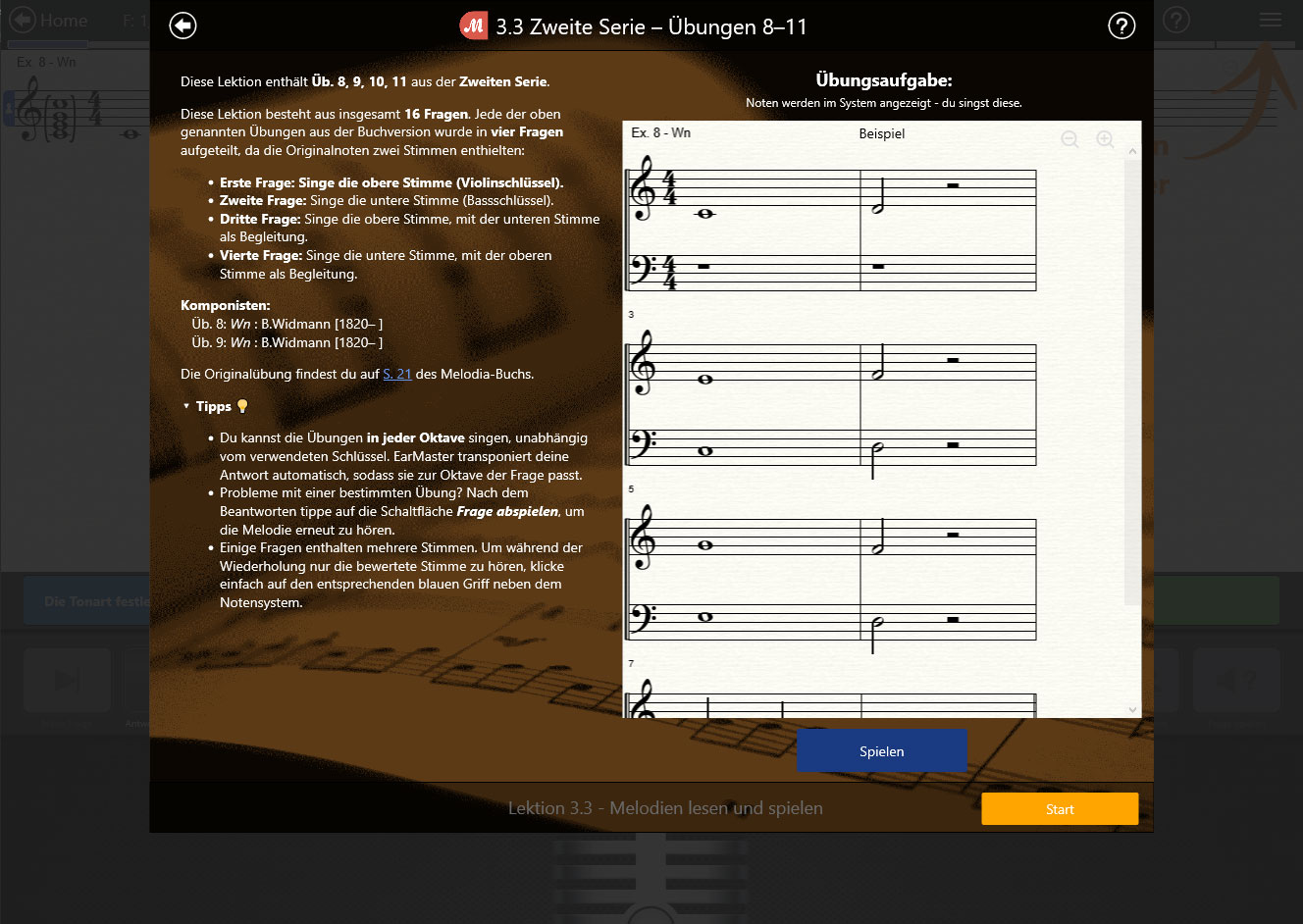 - Mehr als 425 Lektionen mit über 1.500 Übungen zum Vom-Blatt-Singen (Solfeggio).