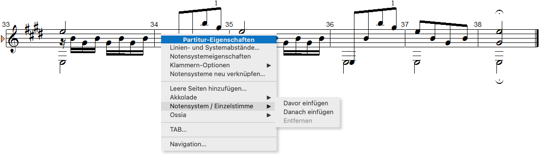 Klicke mit der rechten Maus­taste in ein Noten­system. Das Auswahlmenü Partitur-Eigenschaften erscheint.