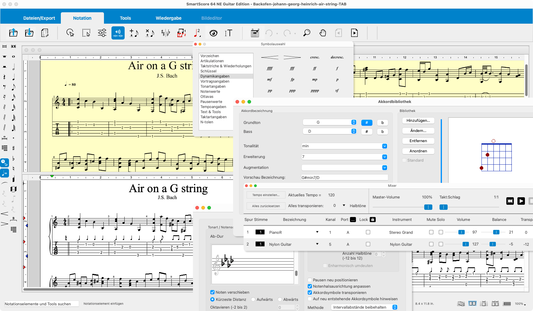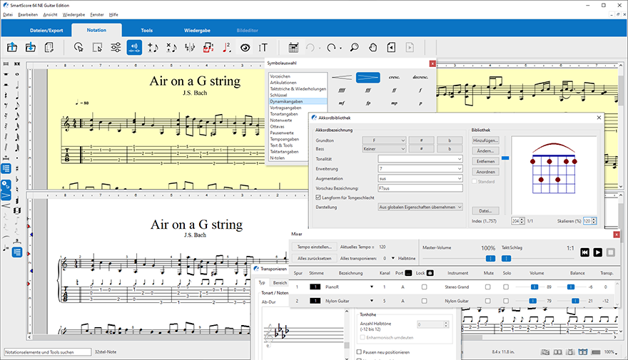 SmartScore 64 Guitar NE ist das Tool für Gitarre und andere (Bund)-Instrumente mit innovativen, leistungsstarken und einzigartigen Features, die auf die Erkennung und Erarbeitung von Standard- und Tabulaturnotation sowie von Akkorden und Griffbildsymbolen ausgerichtet sind. Bei einer Erkennung von bis zu zwei Notensystemen pro Akkolade sind Einzelstimmen, Leadsheets, TABs, Duette, Klaviermusik oder Kombinationen aus Standard- und TAB-Notation das Metier der Guitar-Edition.