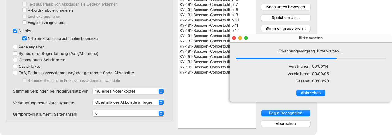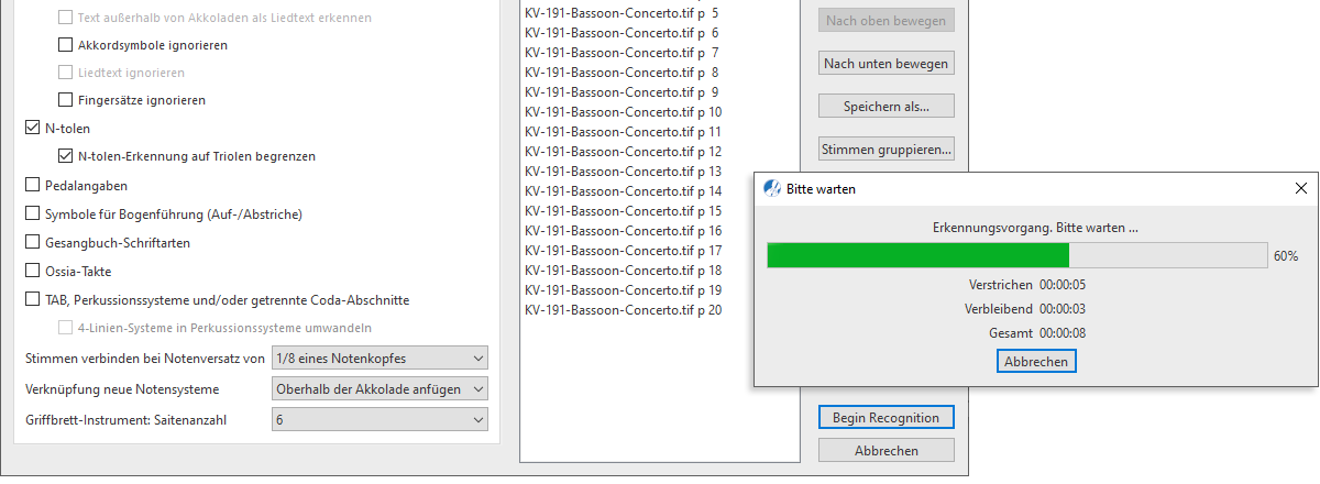 Fenster Notenerkennung sicher, dass alle zu erkennenden Seiten in der richtigen Reihenfolge angeordnet sind. Falls erforderlich, kannst du Seiten in der Seitenliste mithilfe der Tasten