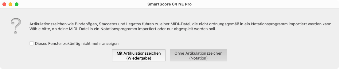 Du wirst nun gefragt, ob du die in den Noten ent­hal­tenen Artiku­lations­zeichen entfernen oder diese behalten möchtest. Bekannt­lich gibt es Artiku­lations­zeichen, welche die Dauer einer Note (Note On/Off-Events) beinflussen (z. B. Staccatos). Verbleiben solche "verkürzten" Noten in der MIDI-Datei, dann kann dies möglicher­weise (negative) Auswir­kungen darauf haben, wie das Notations­programm die MIDI-Datei beim Import inter­pretiert. Für den Export in ein Notations­programm empfiehlt es sich also, die Artiku­lationen aus der MIDI-Datei zu entfernen - oder du verwendest statt des MIDI-Formats gleich das MusicXML-Datei­format, das sich für diesen Zweck besser eignet.