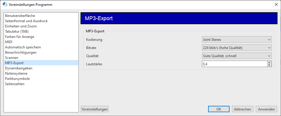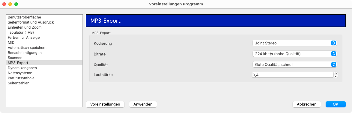 Übrigens: Die MP3-Export­einstellungen (Kodierung, Bitrate, Qualität, Lautstärke) kannst du unter ☰ BEARBEITEN > Voreinstellungen Programm >MP3‑Export individuell anpassen: