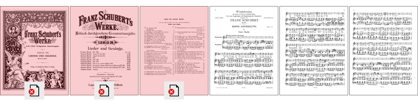 SmartScore erkennt Seiten mit Noten. Sind in mehrseitigen Vorlagen, Scans oder PDFs auch Deckblätter, Titelseiten, Inhaltsverzeichnisse, reine Text- oder redaktionelle Seiten enthalten, so müssen diese vor dem Erkennungsvorgang entfernt werden. Im SmartScore-Bildeditor ist das mit einem Klick erledigt.