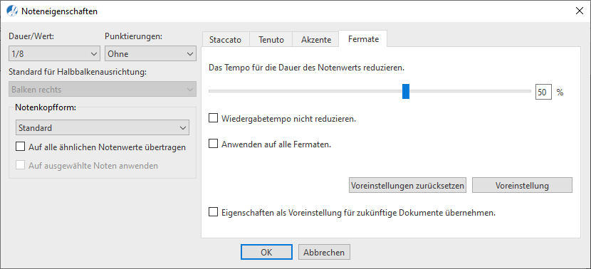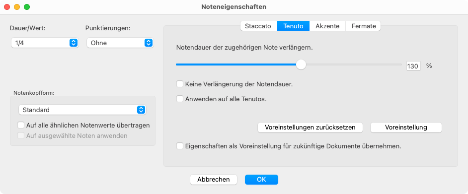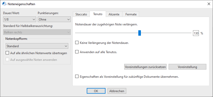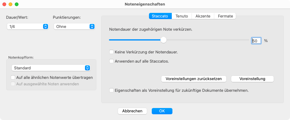 Einstellungen für zukünftige Dokumente übernehmen: Hiermit definierst du qausi neue Programmvoreinstellungen für die Wiedergabeeigenschaften von Staccatos, Tenutos, Akzenten und Fermaten.