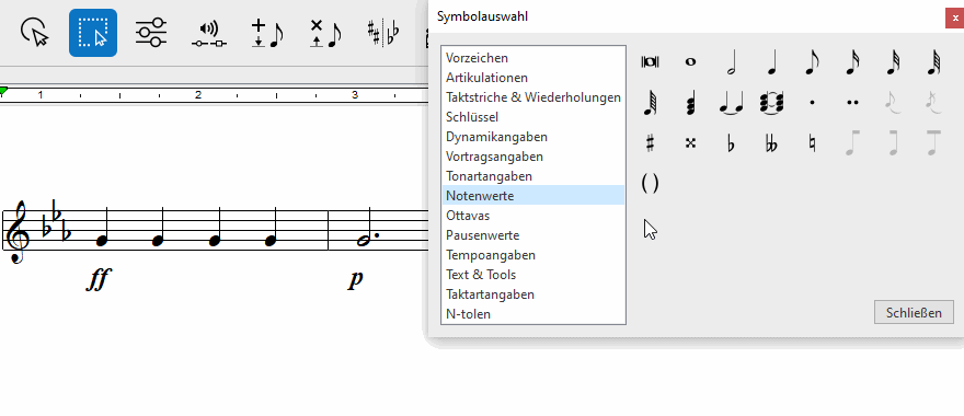 + Klick), um die Dynamikangabe - sofern vorhanden - direkt in der Notation als Tool anzuwählen.