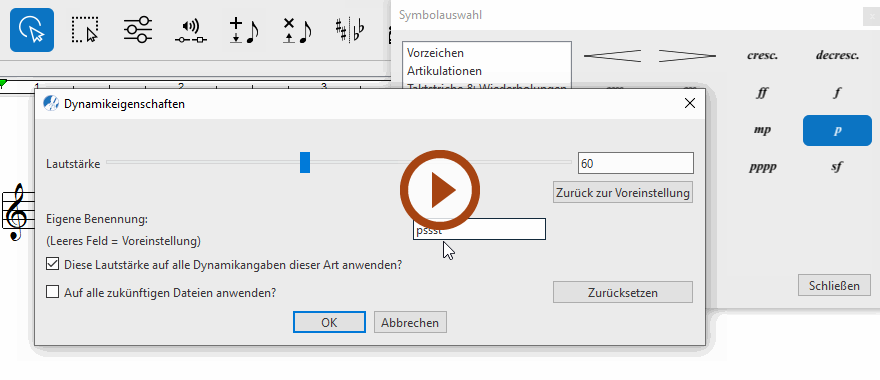 Eigene Benennung: In diesem Feld kannst du einer Dynamikangabe eine beliebig andere Bezeichnung geben, die dann in den Noten erscheint.