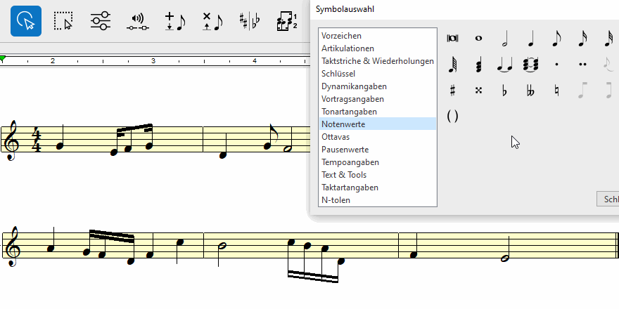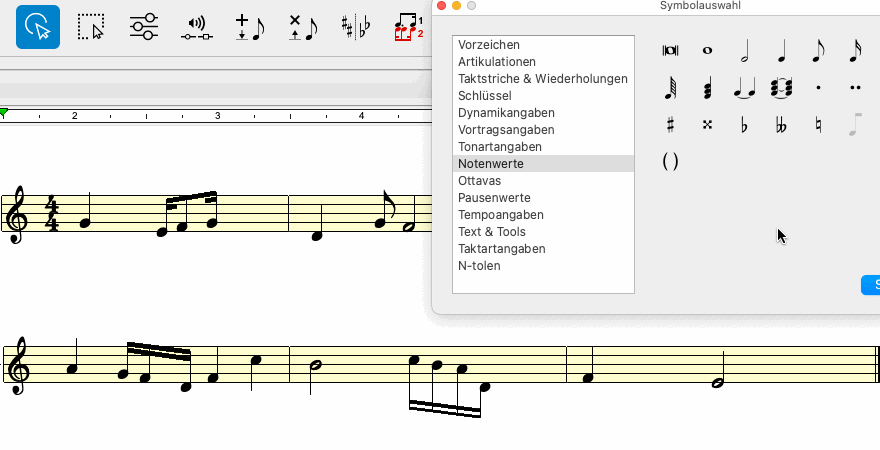 Wähle einen Noten- oder Pausen­wert. Nutze dazu das Fenster Symbolauswahl , die Quick-Select-Methode  + Klick) oder Tastatur­befehle.