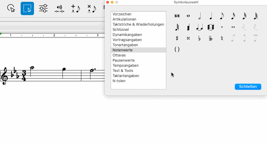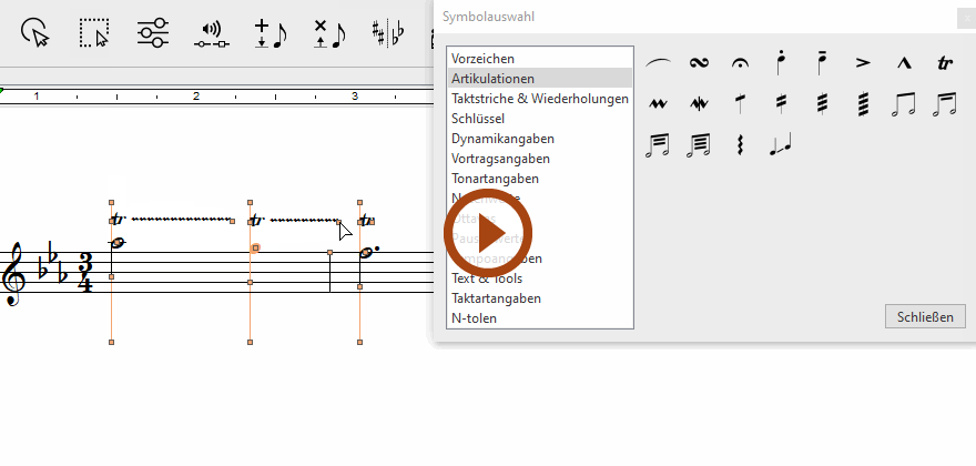 . Du findest es in den Toolleisten Notation, Tools und Wiedergabe. Noch einfacher gelingt der Aufruf des Eigenschaften-Tools mit der ESC-Taste auf der Computertastatur. Klicke dann auf ein Trillersymbol (tr) in deinem Dokument