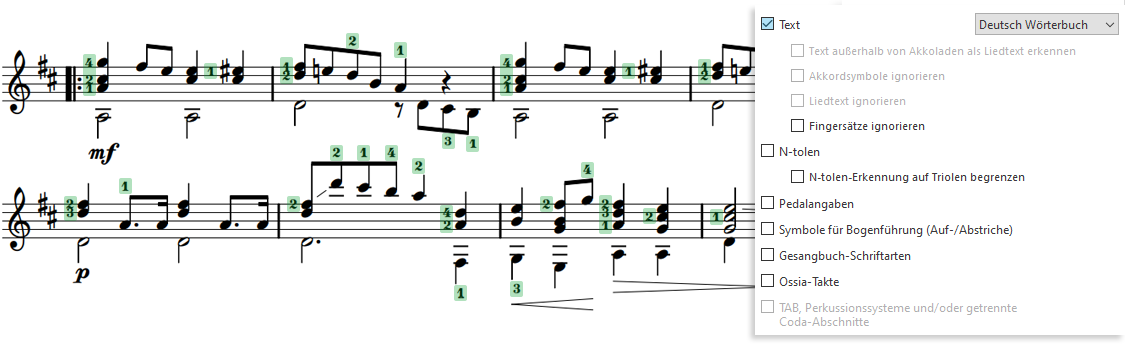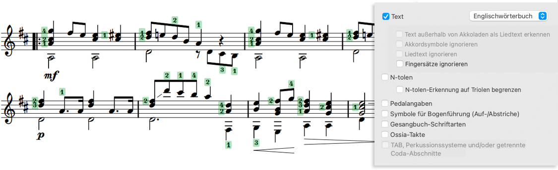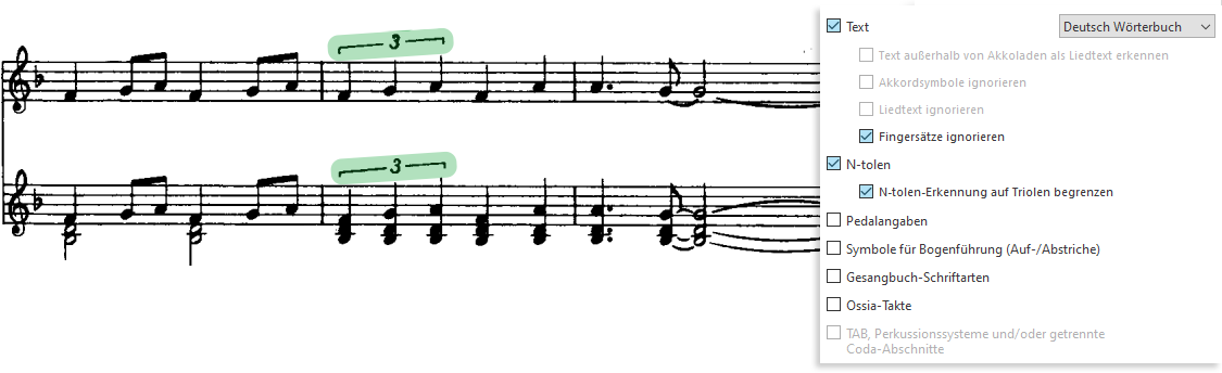 Vielleicht möchtest du, dass ganz bestimmte Elemente deiner gescannten oder importierten Noten bei der Erkennung berücksichtigt werden, andere aber nicht. Im Tab Optionen des Fensters Notenerkennung findest du eine ganze Liste an Notationselementen, die du an- und abwählen kannst.