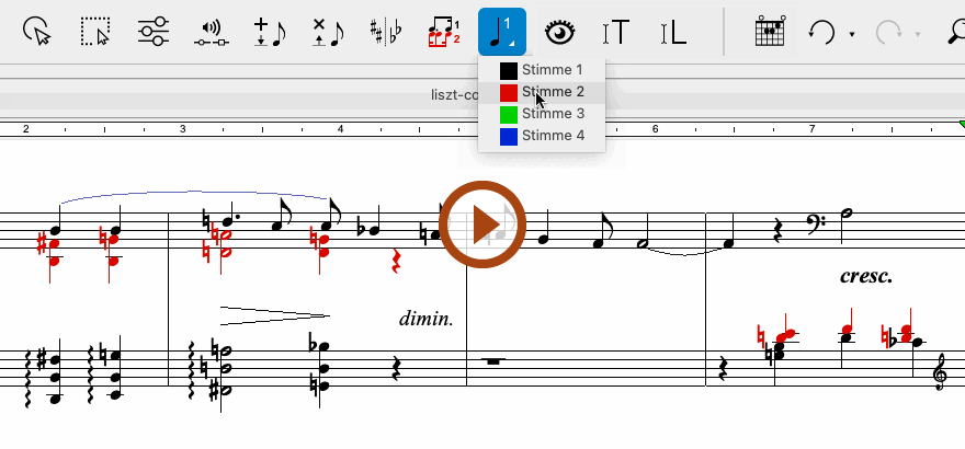 Klicke rechts daneben auf die Taste Stimmen­zuordnung und -farbe . Wähle aus der sich öffnenden Liste eine andere Stimmen­nummer (Stimme 1 - 4).